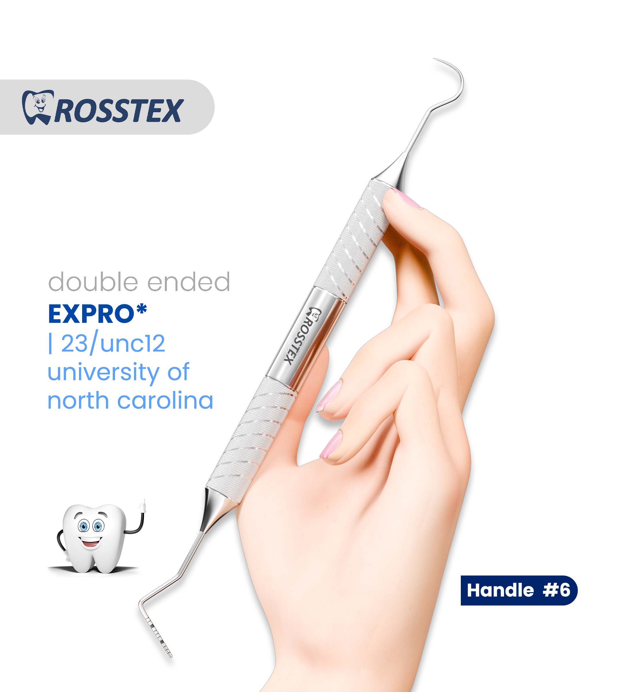 Expro XP23/UNC12 is a double-ended dental instrument that combines a cp-unc12 probe, marked from 1 to 12, for precise periodontal measurements, with an explorer on the opposite end for detecting surface irregularities and caries.