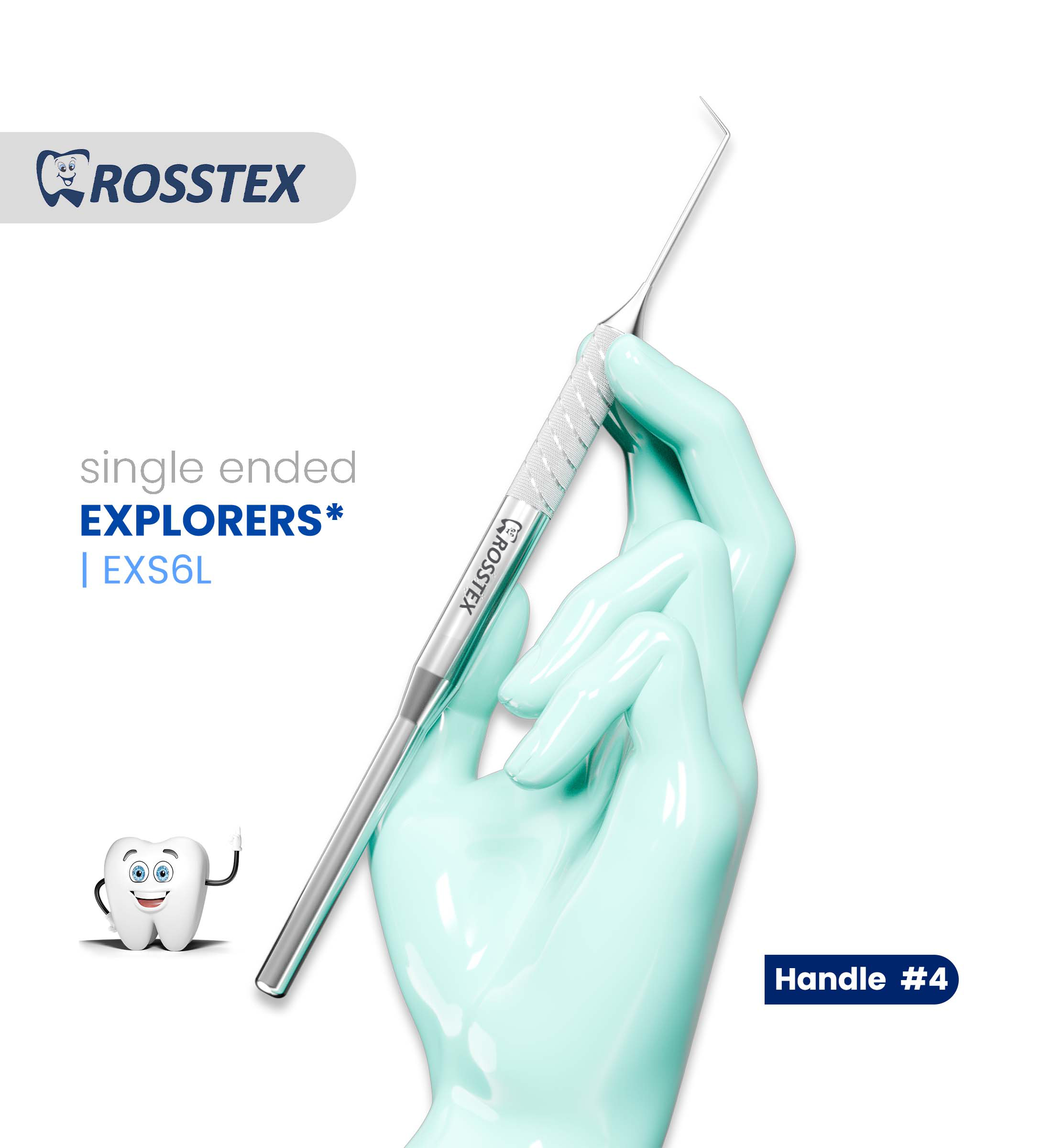 EXS6L Dental Explorer features a 9mm tip with a long, straight shank, ideal for accessing and examining deep periodontal pockets and hard-to-reach areas. The flexible but strong nib has a sharp bend at the tip, designed for precise detection and penetration in narrow spaces like the apical foramen.