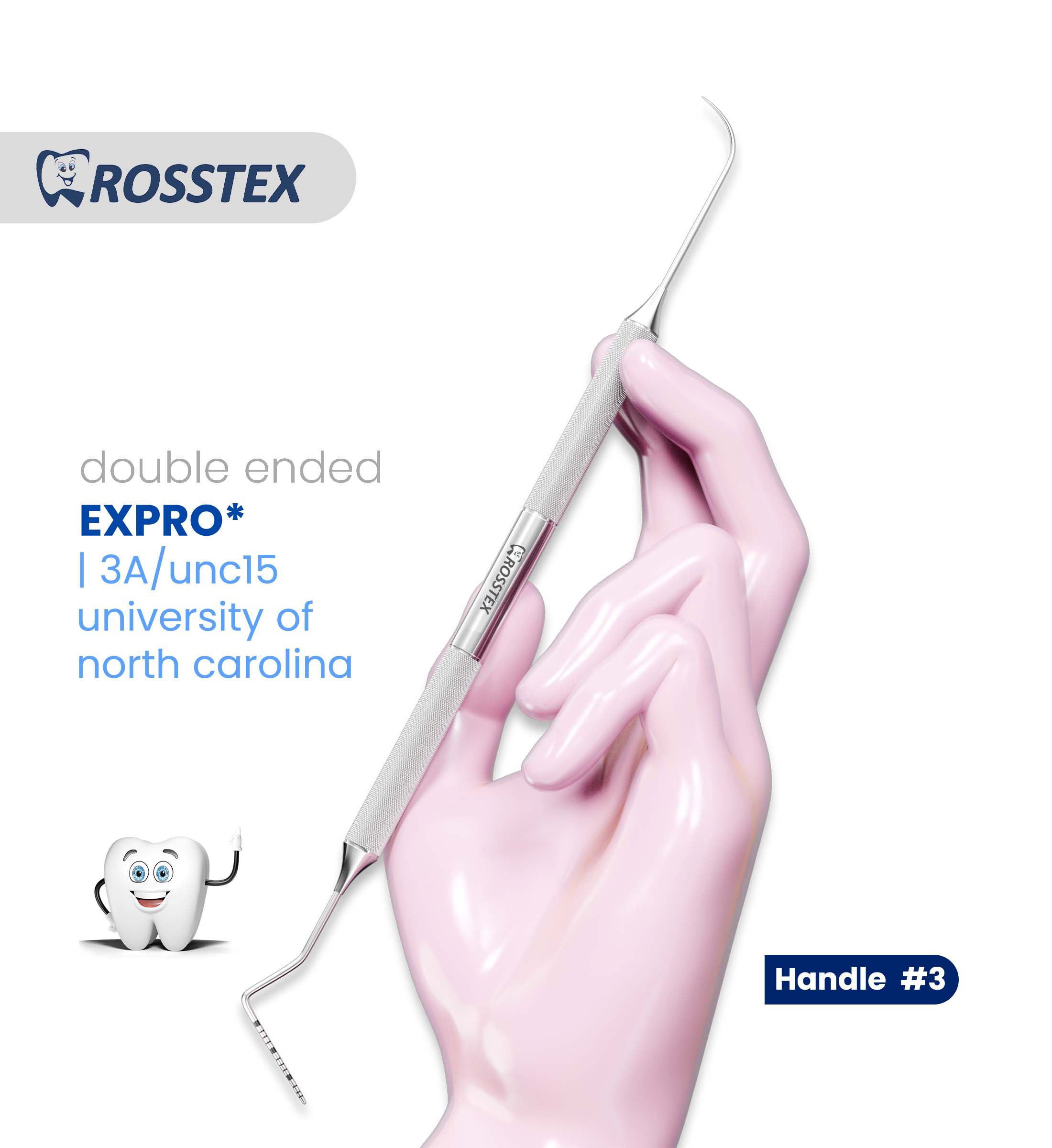 Expro 3A/UNC15 is a double-ended dental instrument that combines a 3a explorer with a unc15 probe. The UNC15 Probe end features precise markings from 1 to 15 for accurate periodontal assessment, while the 3A explorer is designed for tactile examination of tooth surfaces and detection of caries.