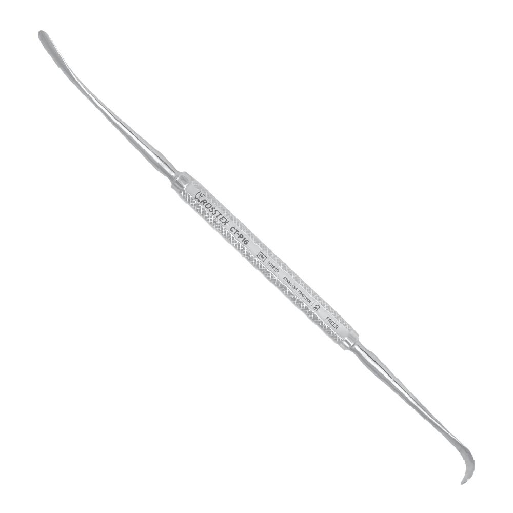 Periosteal Freer Elevator P16 (21.0 cm) is designed for lifting and retracting the mucoperiosteum after gingival incisions. Its dual-ended design allows precise and atraumatic tissue elevation, making it ideal for oral, periodontal, and maxillofacial surgical procedures.