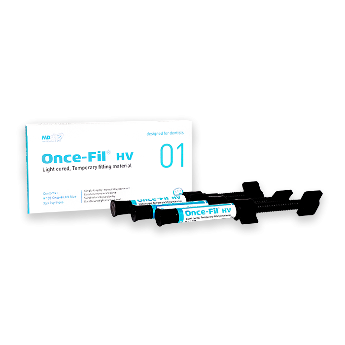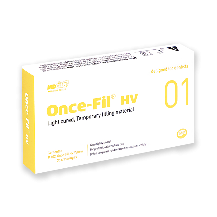 Once-Fil HV is a light curing temporary filling material. Due to its elastic and high viscous characteristics, it can be used simply, easily and suitably for temporary filling such as in-lays and on-lays.